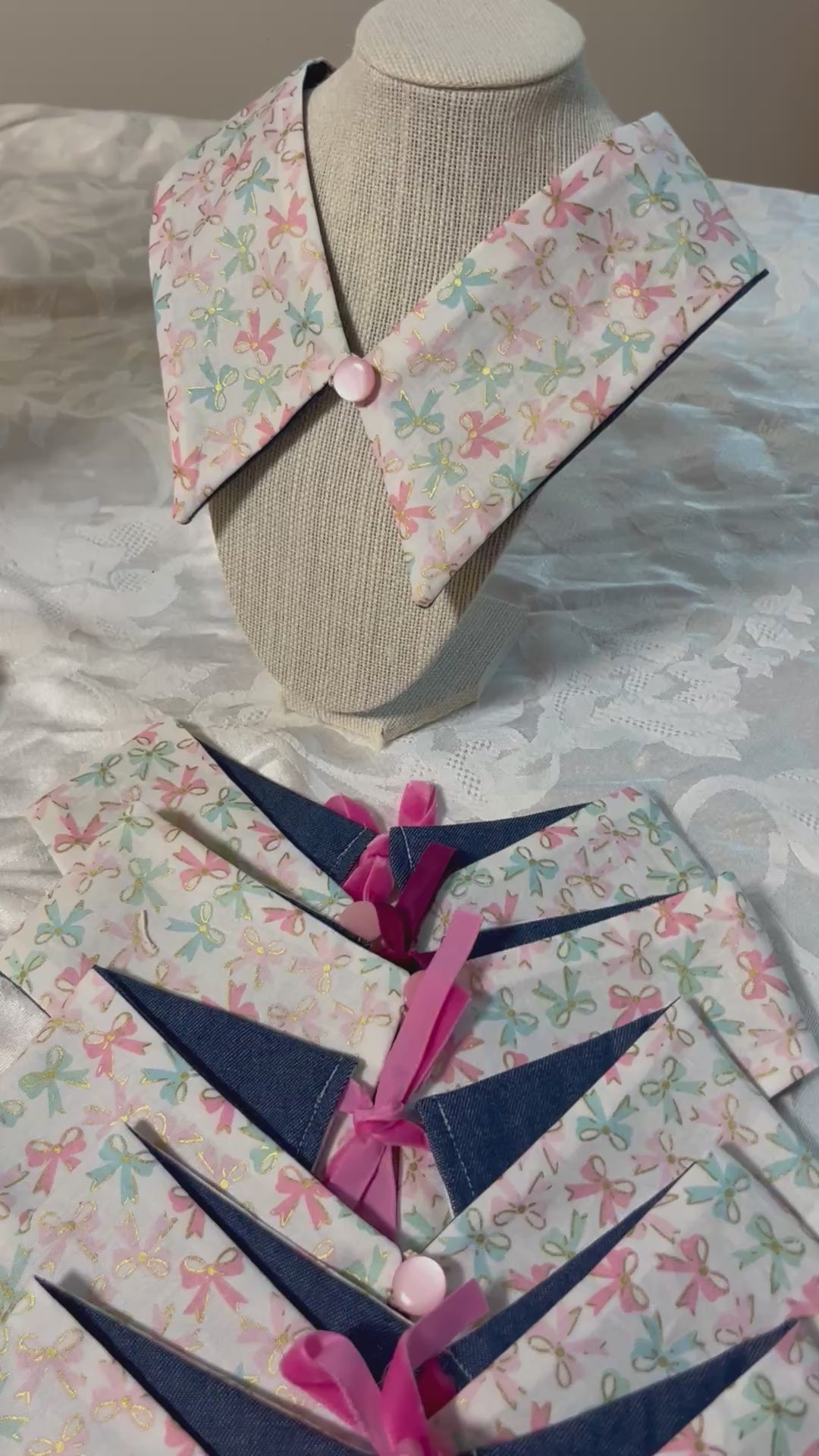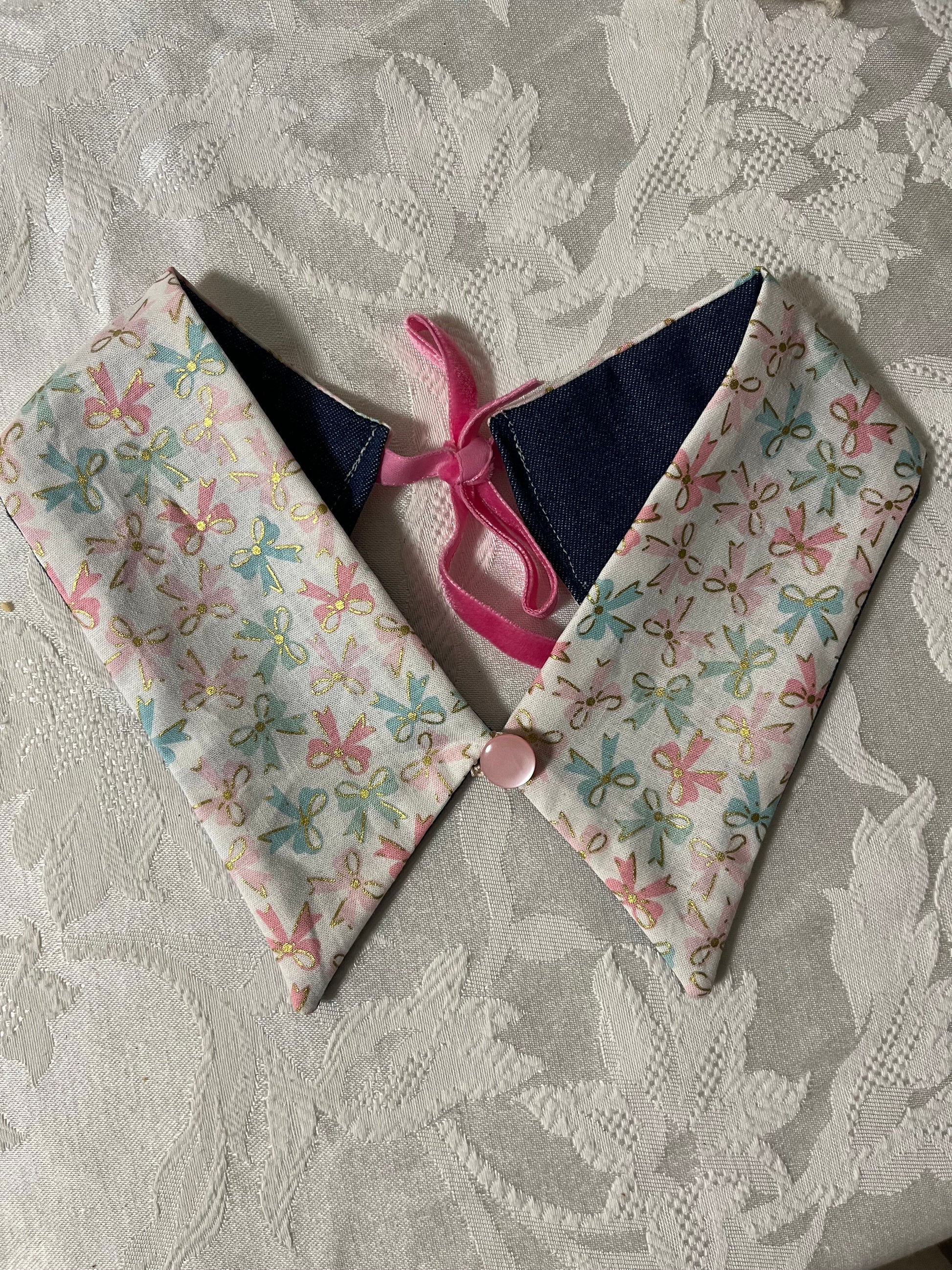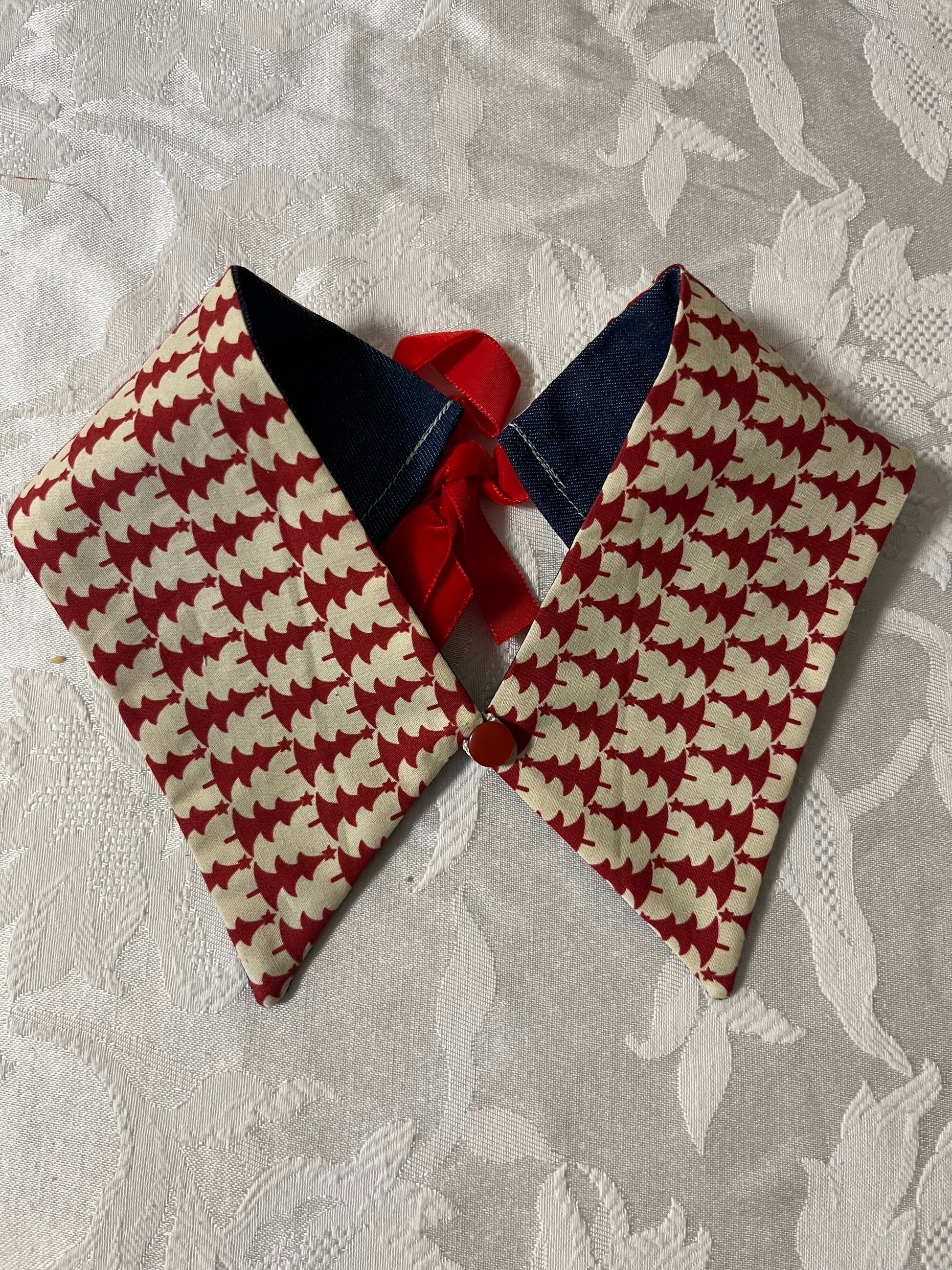 These stylish and unique collars have been handmade by me to adorn your clothing. Wear it for the holiday season, or just because. There are 3 options available - Christmas trees, bows, or vintage embroidery. Lined with denim and embellished with a velvet ribbon and hand crocheted button loop.