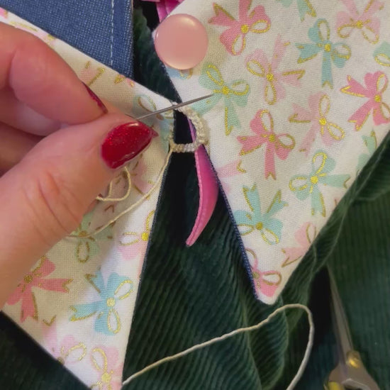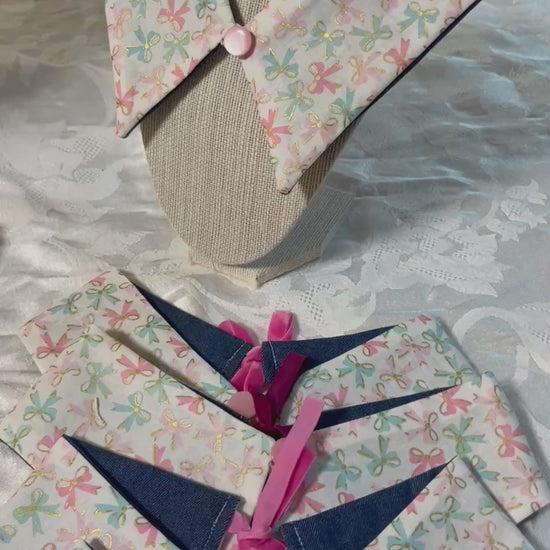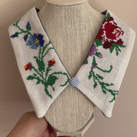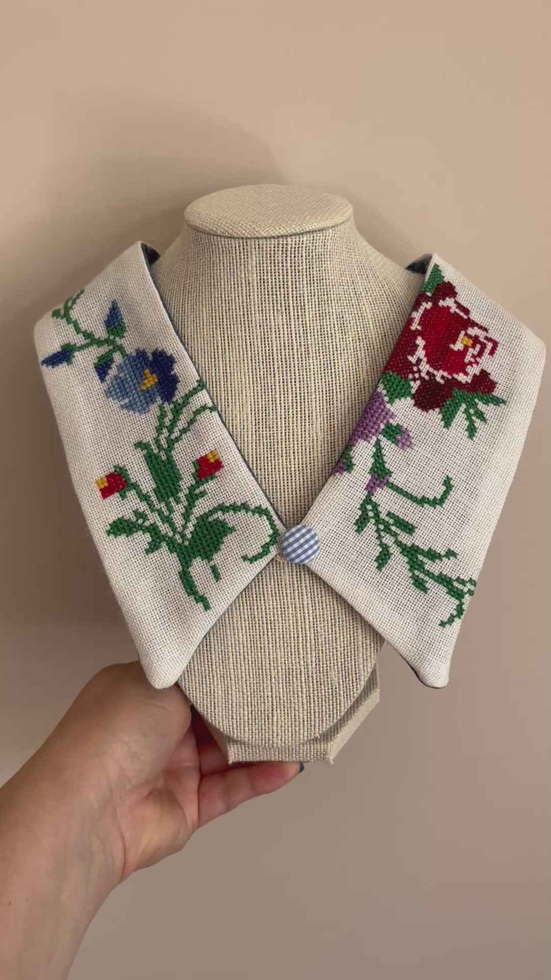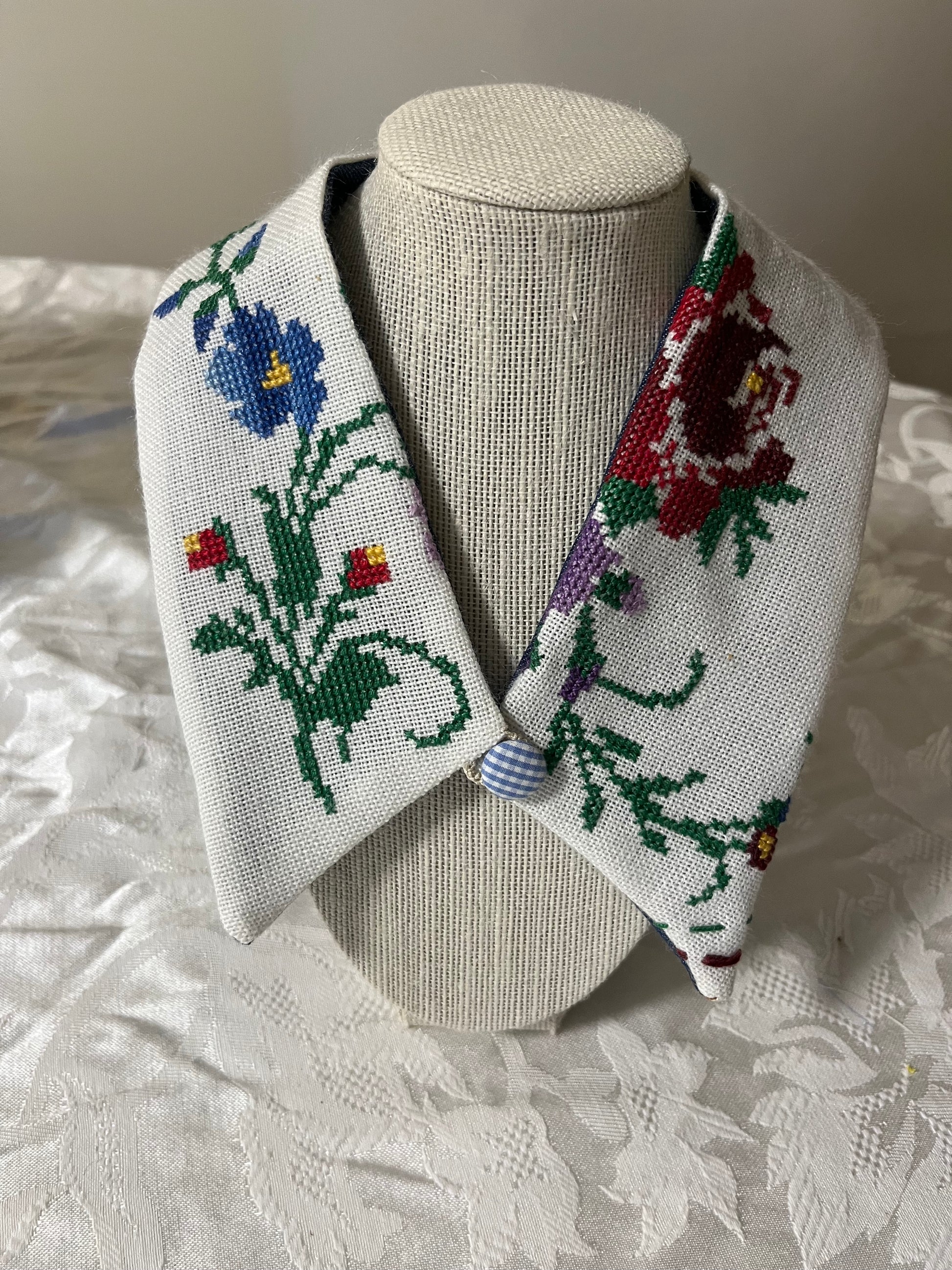 These stylish and unique collars have been handmade by me to adorn your clothing. Wear it for the holiday season, or just because. There are 3 options available - Christmas trees, bows, or vintage embroidery. Lined with denim and embellished with a velvet ribbon and hand crocheted button loop.