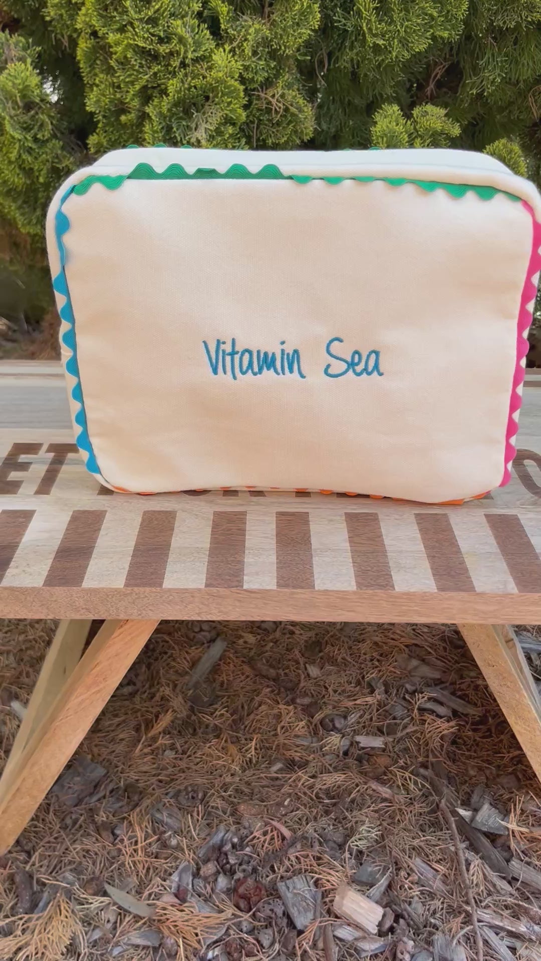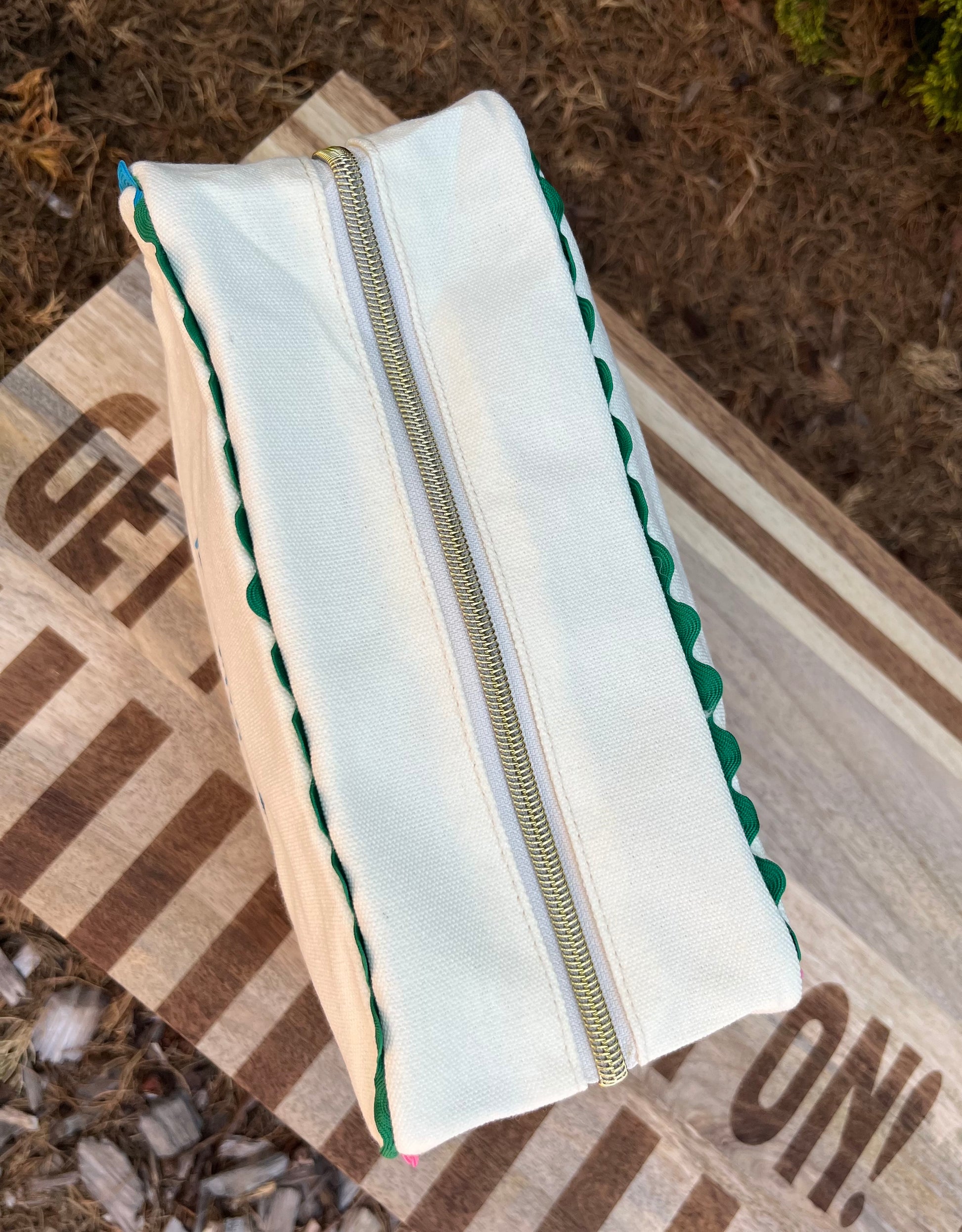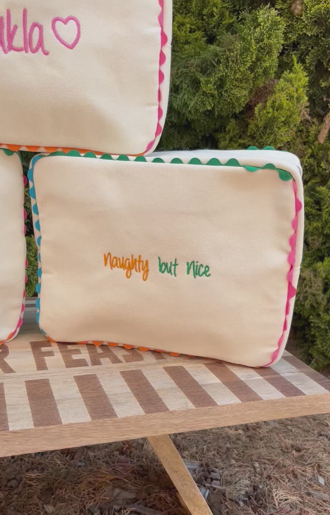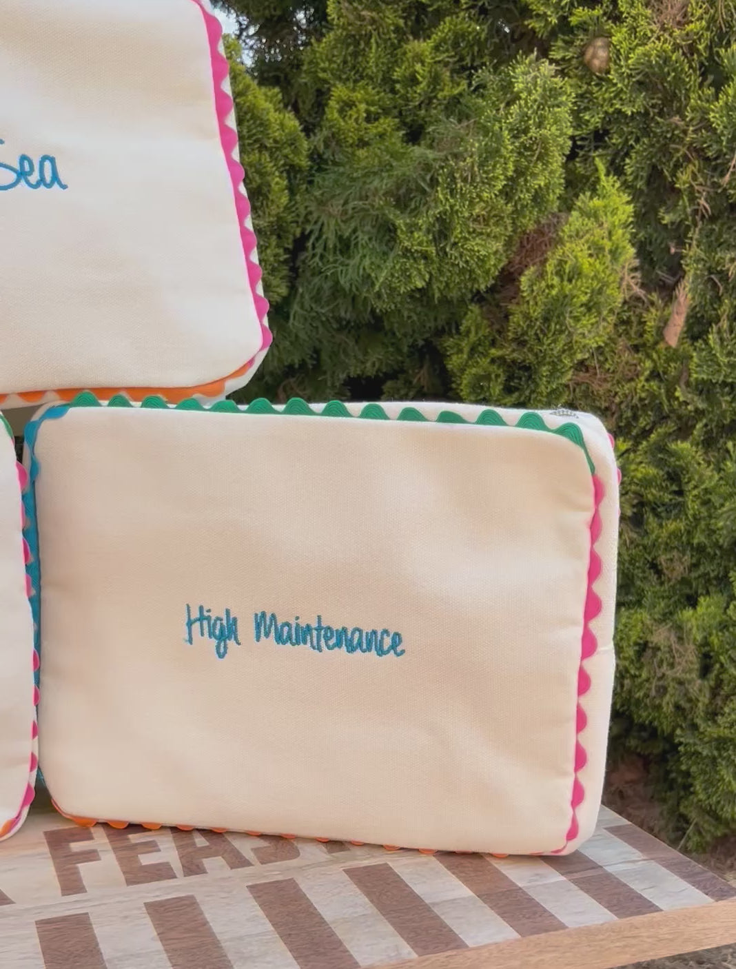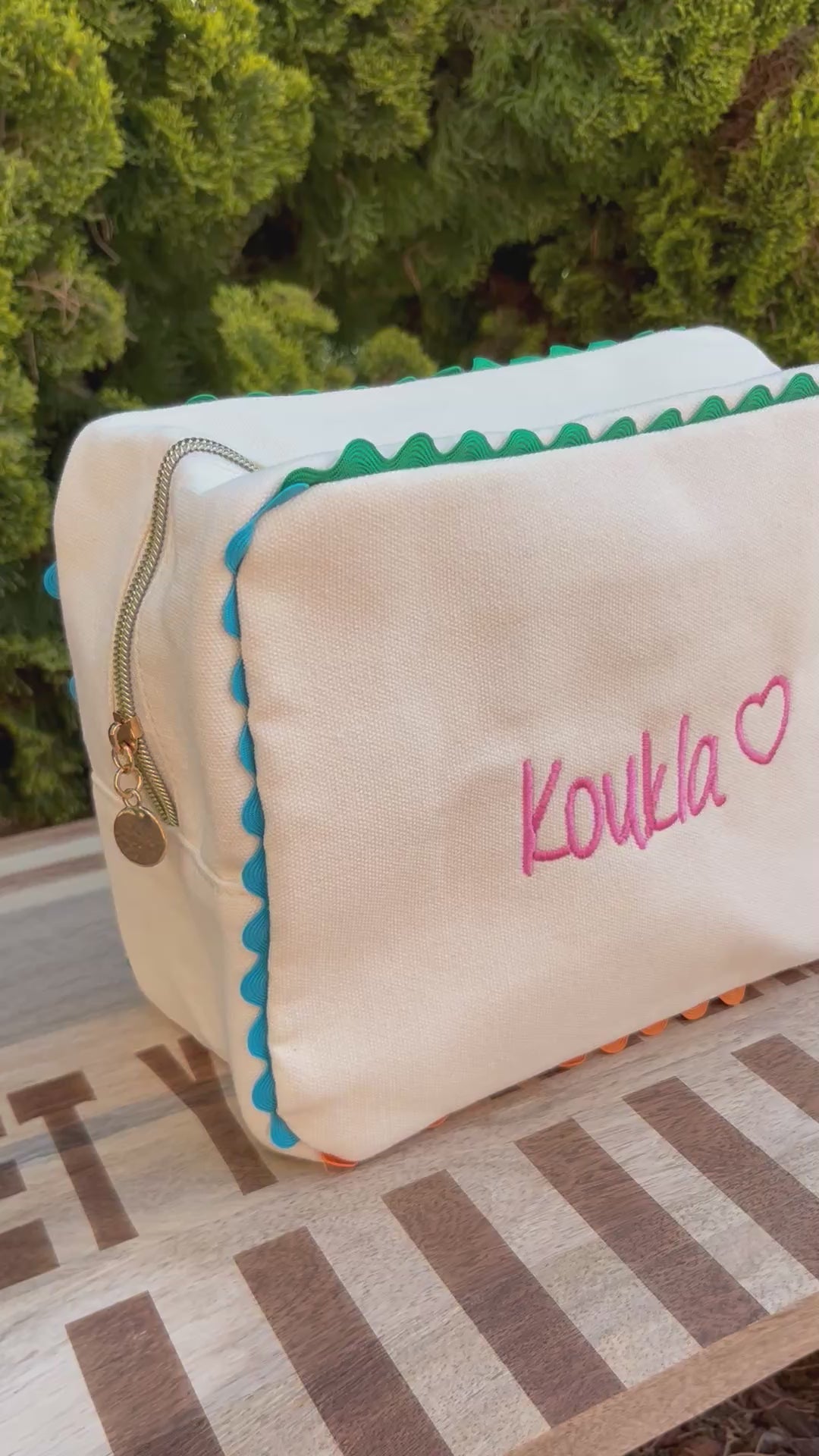 Gorgeous embroidered make-up cosmetic bag made from canvas and adorned with colourful ric-rac and fun embroidery. Choose from 5 different embroidery words - Beauty, Vitamin Sea, Koukla (doll in Greek), high maintenance and naughty but nice. Perfect as a gift for Christmas. The bags measure 10 x 18 x 27cms, they are a great size to fit all your essentials in.